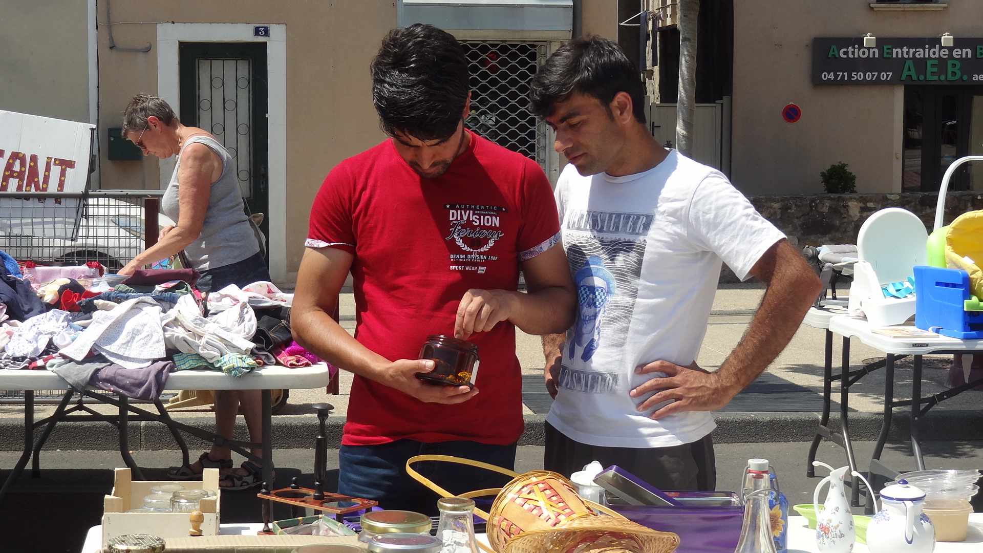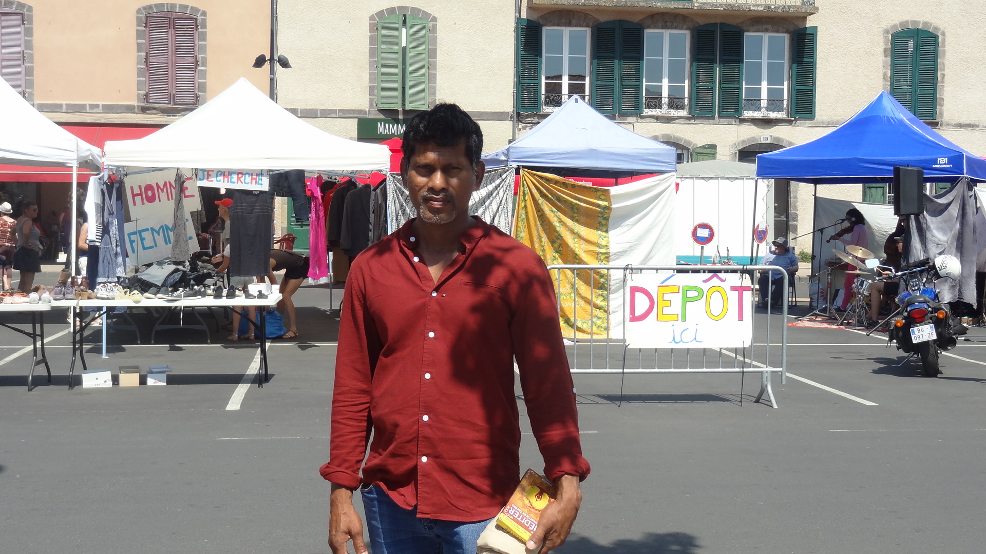 Il faisait déjà très chaud sur la Place du Postel quand nous sommes arrivés à 11h. Nous avons fait le tour des différents tables où étaient déposées les divers objets, vêtements, chaussures, ustensiles de cuisine, vaisselle, livres, jouets, accessoires de puériculture, etc. Chacun a pu y prendre ce dont il avait besoin.