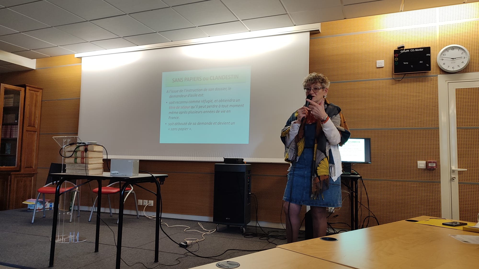 Geneviève, bénévole, a également pris la parole pour raconter le périple d’un exilé qui n’a pas obtenu le statut de réfugié qui est donc, devenu clandestin, avec un mode de vie précaire et déshumanisé ; elle précise qu’il travaille avec des bulletins de salaire! Dans un métier en tension : ouvrier dans le bâtiment. Exemple qui illustre parfaitement l’insertion professionnelle des exilés même sans papiers !!! P., a souligné que :