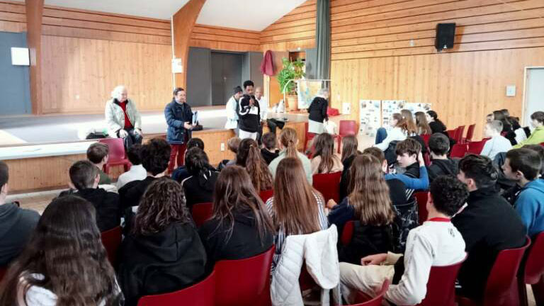 Deux bénévoles les accompagnaient dans cette démarche : Patrick et Geneviève. À leur arrivée, ils sont accueillis par Pierre, le professeur à l’initiative de cette rencontre. Direction la salle communale et premiers contacts avec les collégiens.