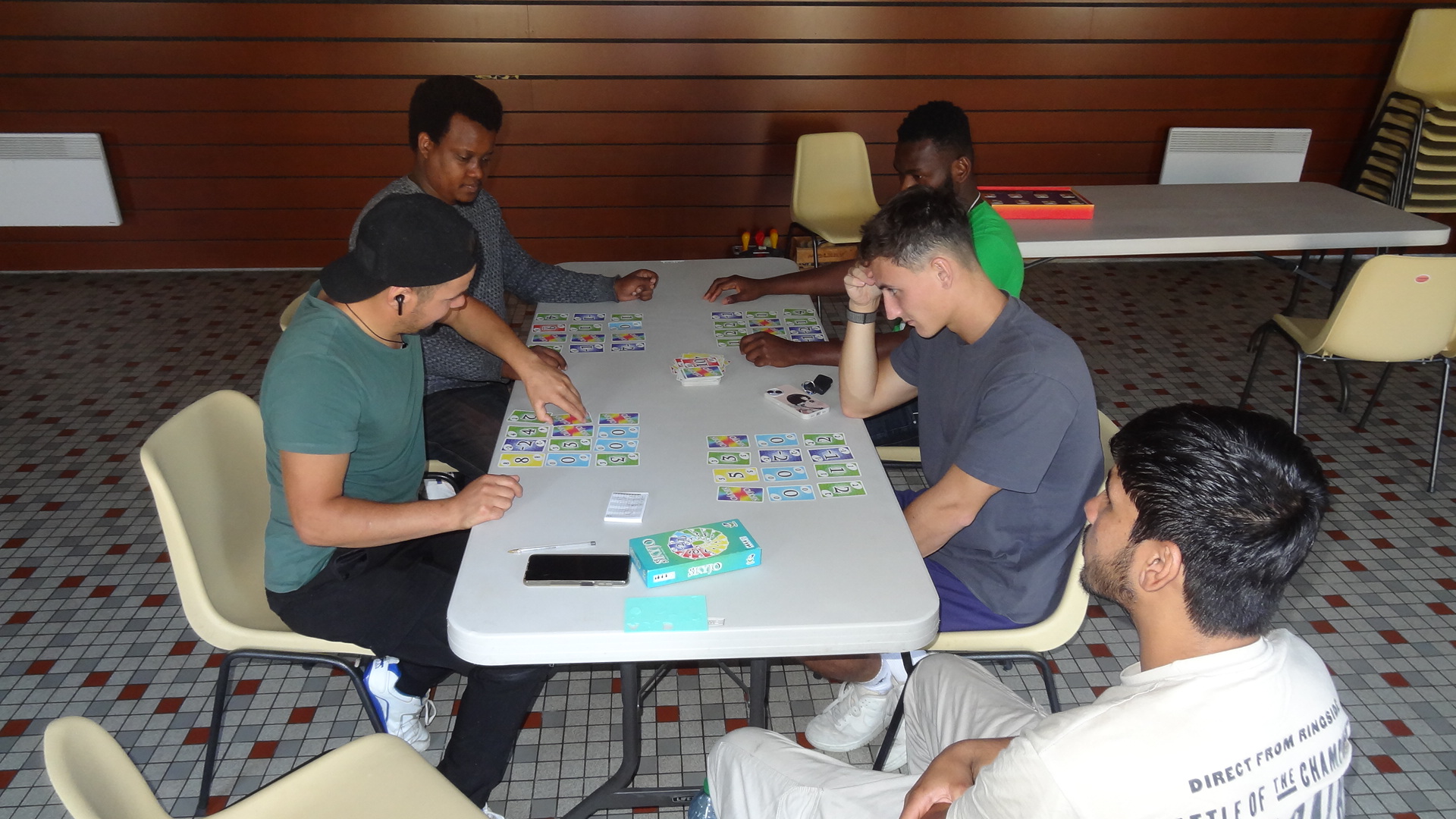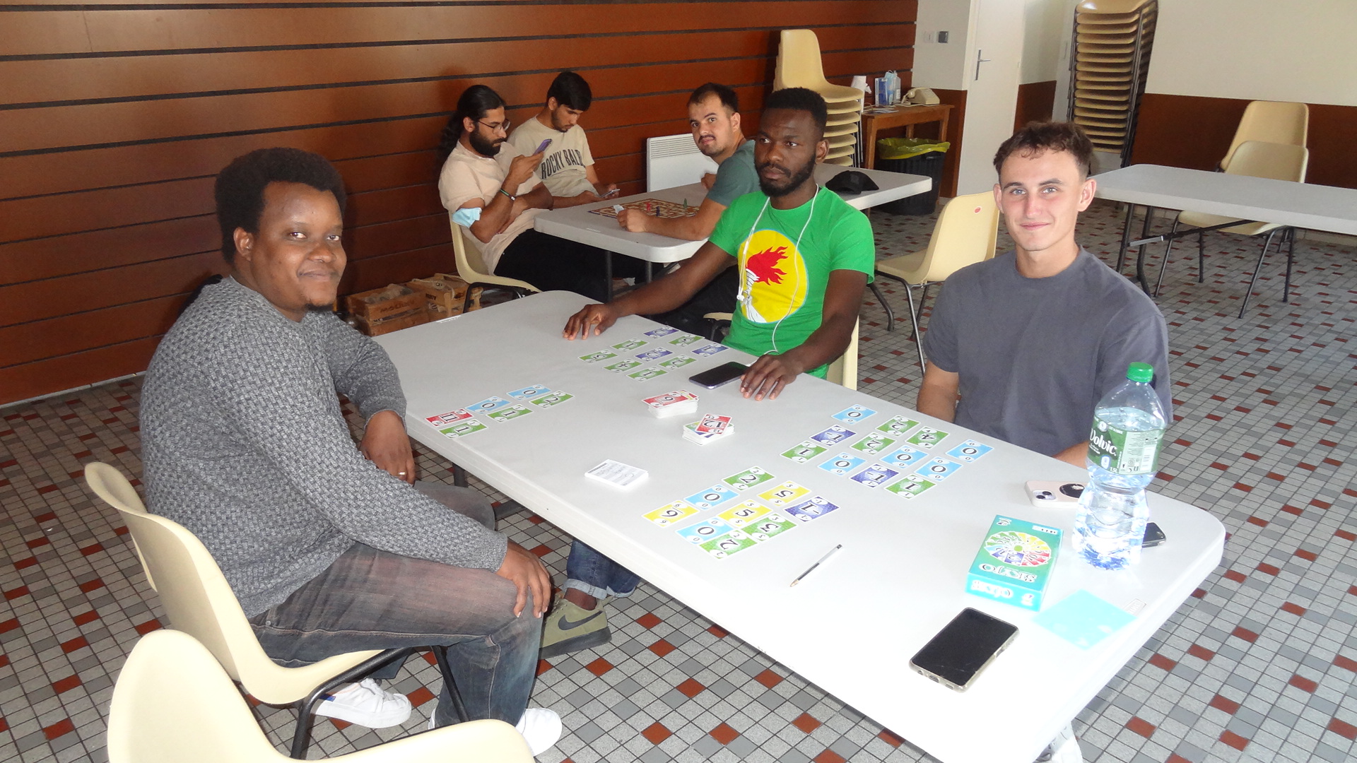 Nous n'avons sans doute pas très bien communiqué et annoncé l'événement, car en fait d'habitants de Lubilhac, nous n'avons eu que Richard, avec qui nous avions fait connaissance, lors du dernier Thé-Café. Les dames que nous avions rencontrées et qui voulait jouer à la belote (nous avions pris, à cet effet, un jeu de 32 cartes) ne sont pas venues. Cela ne nous a pas découragé. Nous avons formé différentes équipes autour des tables de jeux: Walid, I et K au labyrinthe, Richard et K au Scrabble et Lucas, A, G et moi-même au Skyjo.