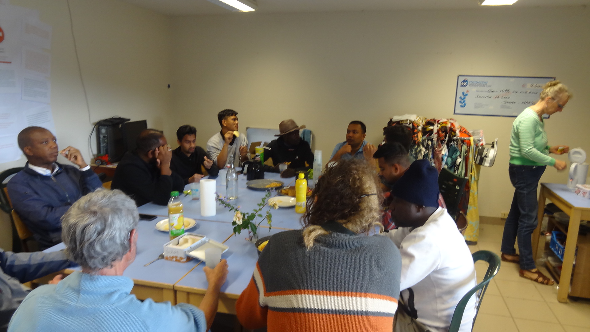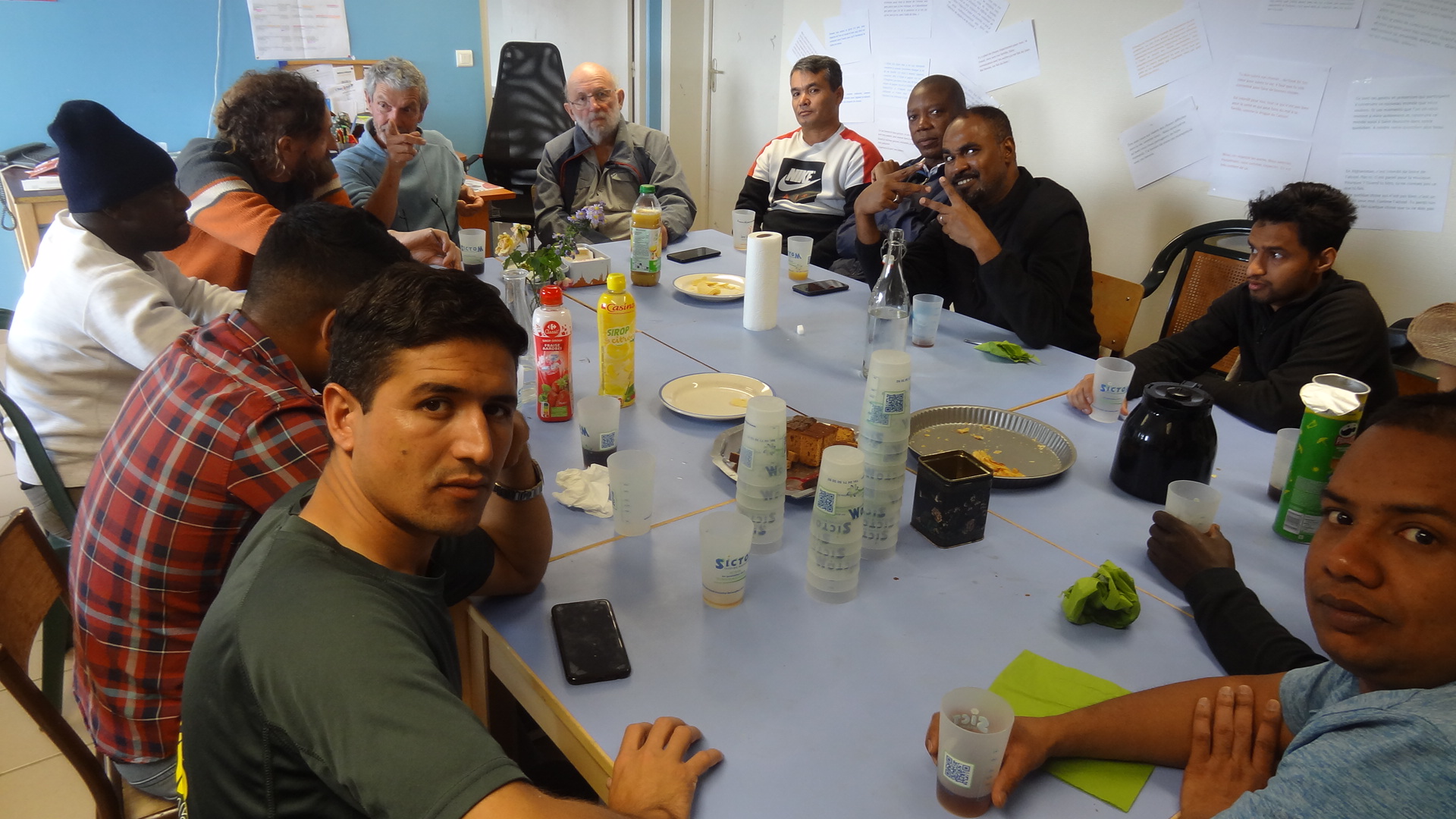 Excellente surprise. À 15h, nous avons vu arriver par groupe les bengalais, les africains, peu d'afghans (ils étaient au Mézenc), de vaillants bénévoles-habitants du territoire. Si ces derniers avaient bien confectionné quelques gâteaux, en revanche la consigne de préparer des pâtisseries qu'avait fait passer Anne-Lena auprès des résidents n'avait pas été très bien suivie. "On ne sait pas faire". D'où l'idée de créer prochainement des ateliers "pâtisserie".