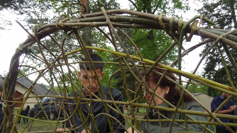 Ainsi réchauffées par un bon plat, les Brindilleuses ensemble avec quelques résidents ont achevé le visage en vannerie aléatoire.