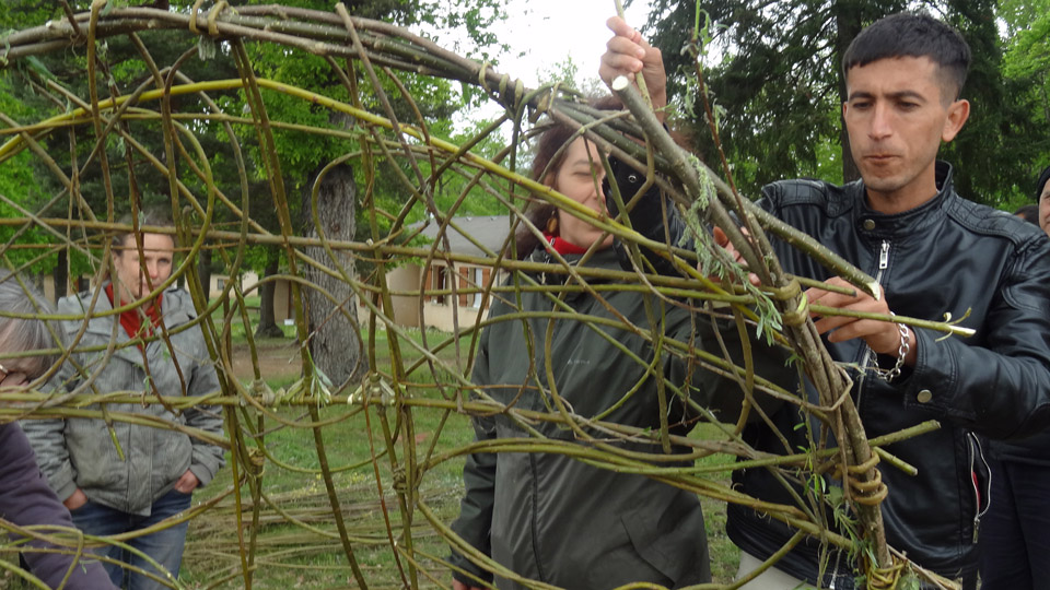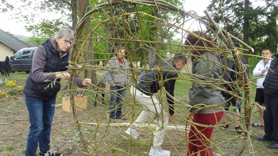 Puis vint le 10 mai, premier des deux jours de création de l’œuvre d’art et atelier participatif avec les demandeurs d’asile. Mais en choisissant les dates nous n’avions pas pensé aux Saints de Glace. Ils étaient bien au rendez-vous, et nous ont offert un temps pluvieux à 10° maximum. Mais Myriam, Cathy, Alexandra et Nathalie ne se sont pas laissées décourager. Heureusement Damienne, bénévole de La Loco, venait en renfort car côté résident il n’y avait pas un qui pointait le bout de son nez dehors par ce temps froid. (Occasion pour N. pour nous dire fièrement « ça caille » qu’est-ce qu’on apprend bien le français avec La Loco.) Mais vers midi la curiosité fut plus fort que le froid, et une dizaine de résidents se passaient le témoin ou plutôt l’osier en avançant sur le projet.