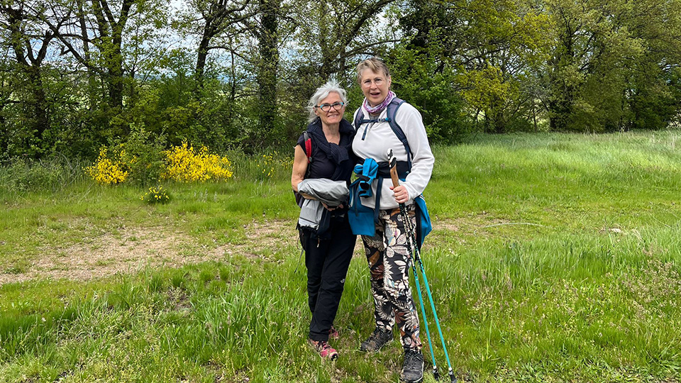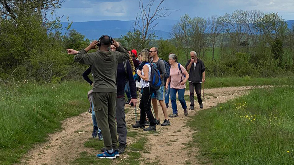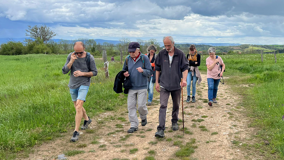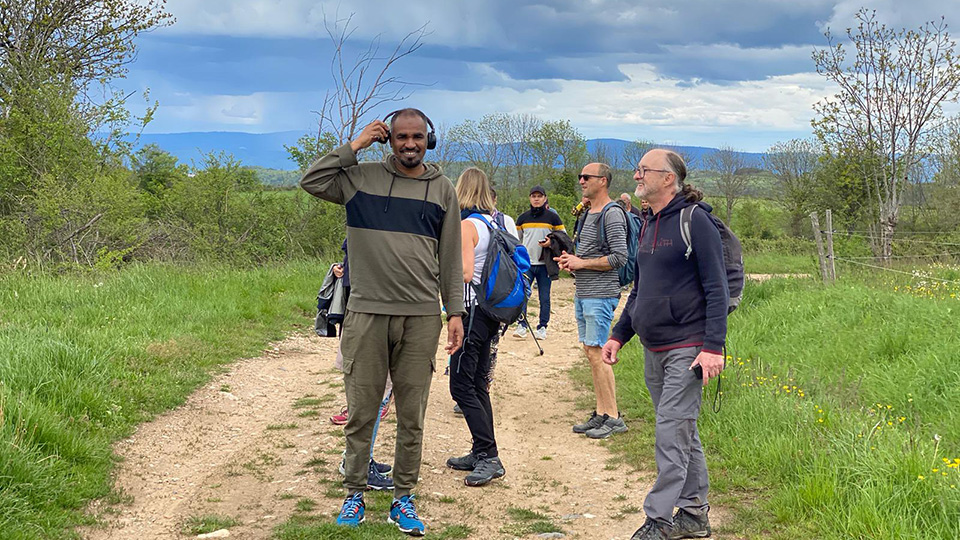 Comme le rendez-vous de départ avait été donné au stade de St-Just (le Sabatoux), nous avons, dès 13h30, pour ceux qui disposaient de places, covoituré les résidents à partir du Cada. À 14h, au départ, en fin de compte, nous étions une petite vingtaine, moitié résidents, moitié habitants/bénévoles.