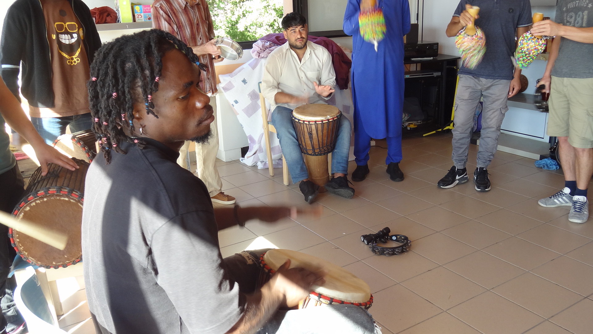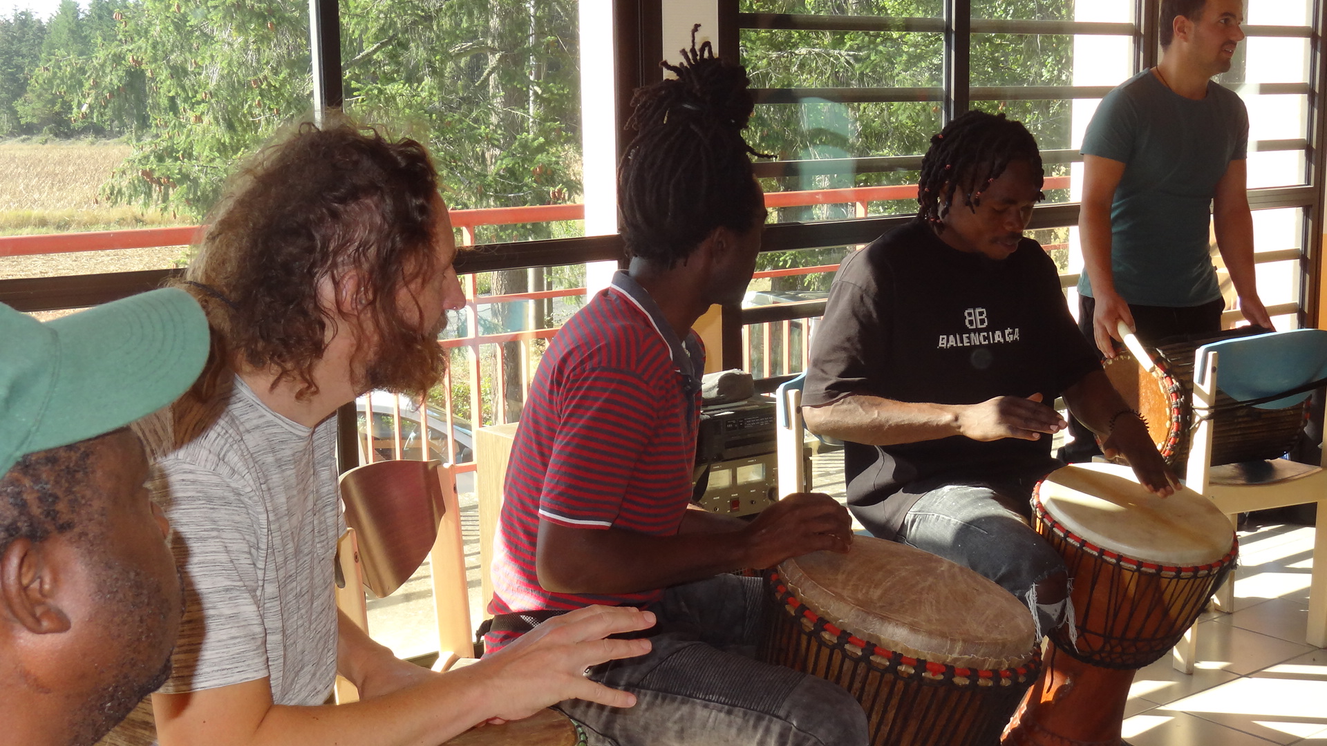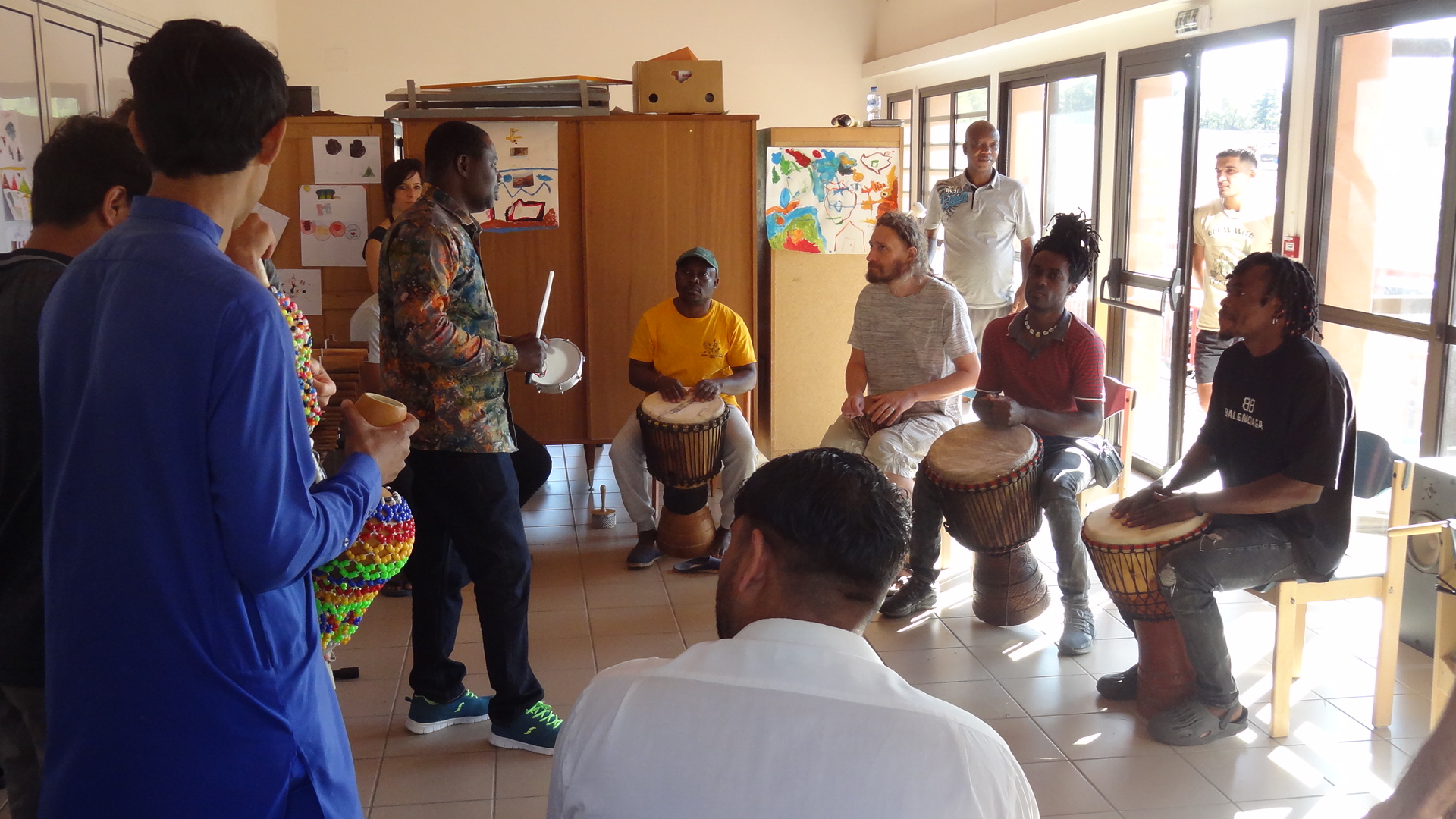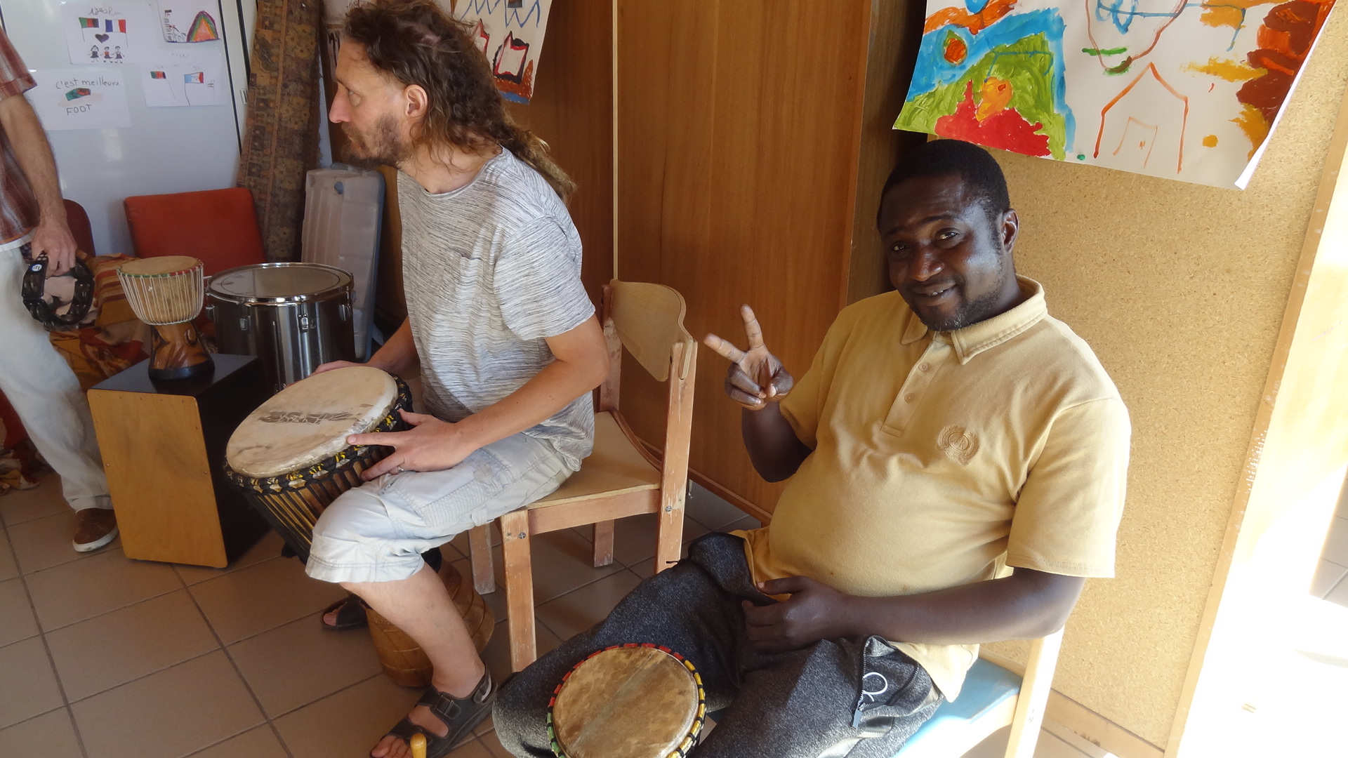 Sans attendre K. le stage a commencé. Sous la direction de Moussa du groupe Niaramy, djembés, dunun, shékéré, bendir, tambourin et autres percussions ont été répartis entre les participants et après quelques premiers essais, en fonction des talents - réattribués - ou non. C'est ainsi que certaines personnes se sont révélées de vrais virtuoses, ainsi M'B. comme soliste au djembé.