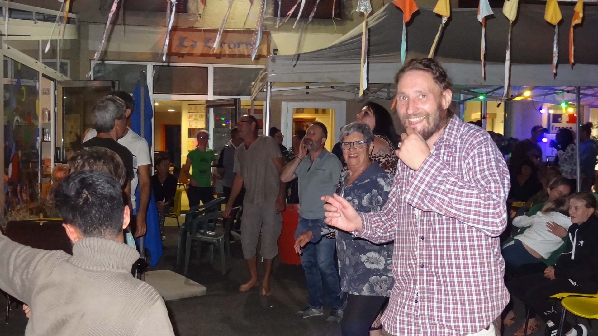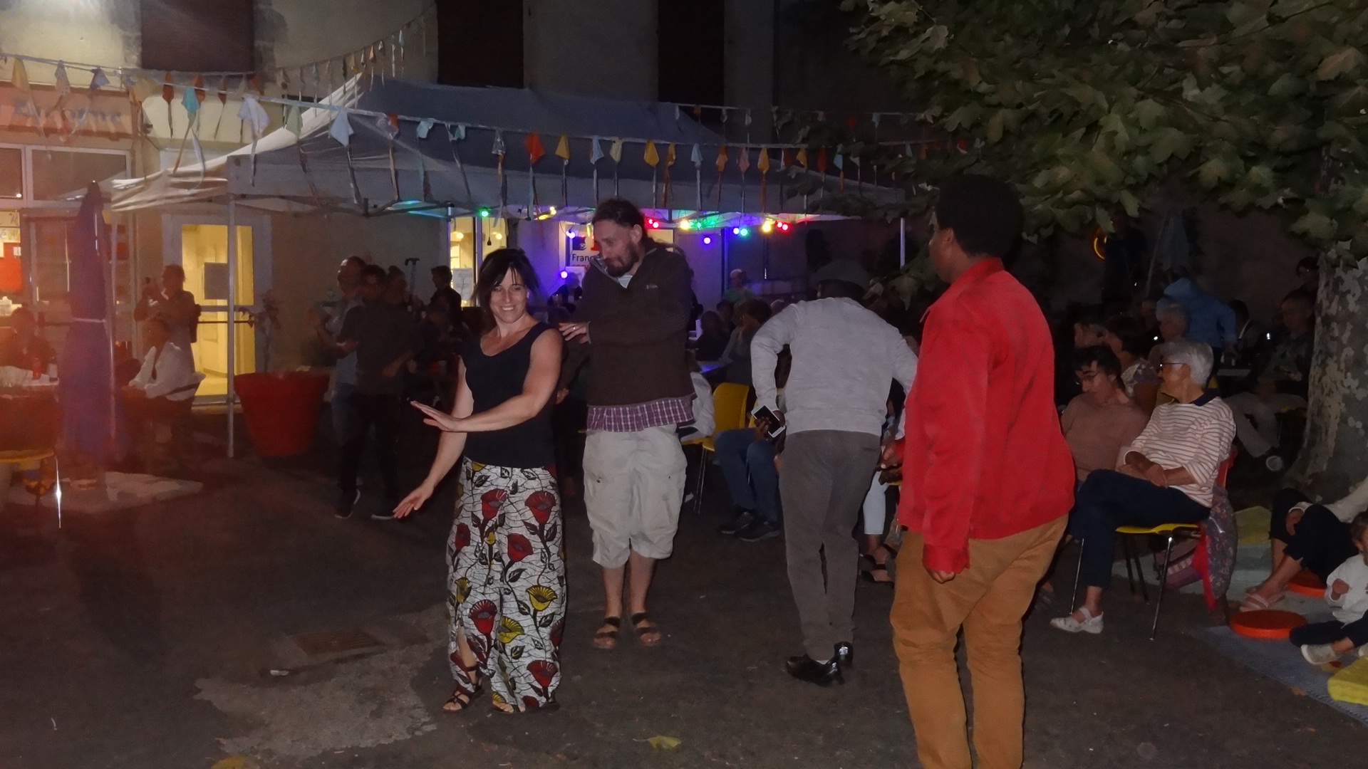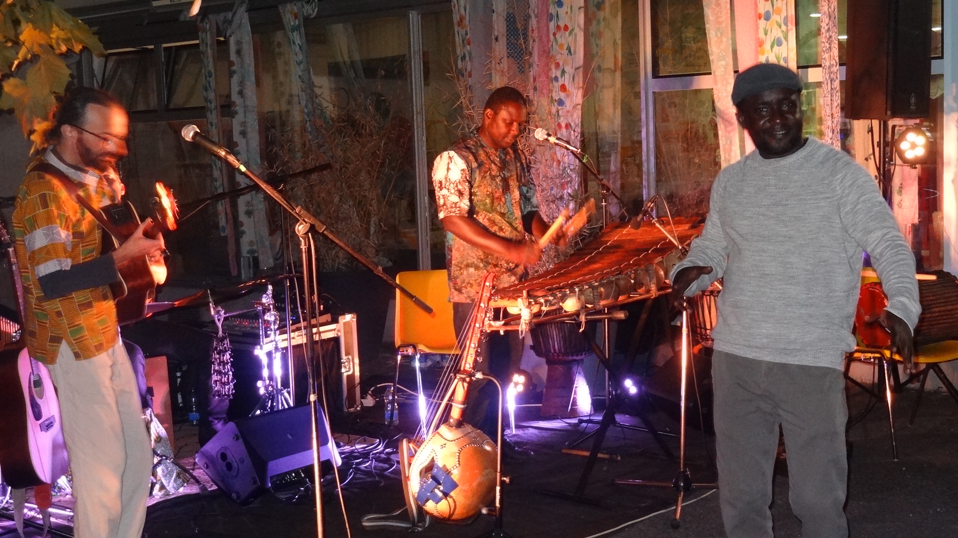 N'y tenant plus, vers la fin du concert, M'B, A. et K. (l'autre K; le premier K étant occupé dans une danse endiablée) sont remontés sur scène (c'est une expression: en l'occurrence, il n'y avait pas de scène, nous étions dans la cour de la Licorne) auprès de l'orchestre ont repris, qui un djembé, qui un shékéré, qui un tambourin et on fait un final explosif: