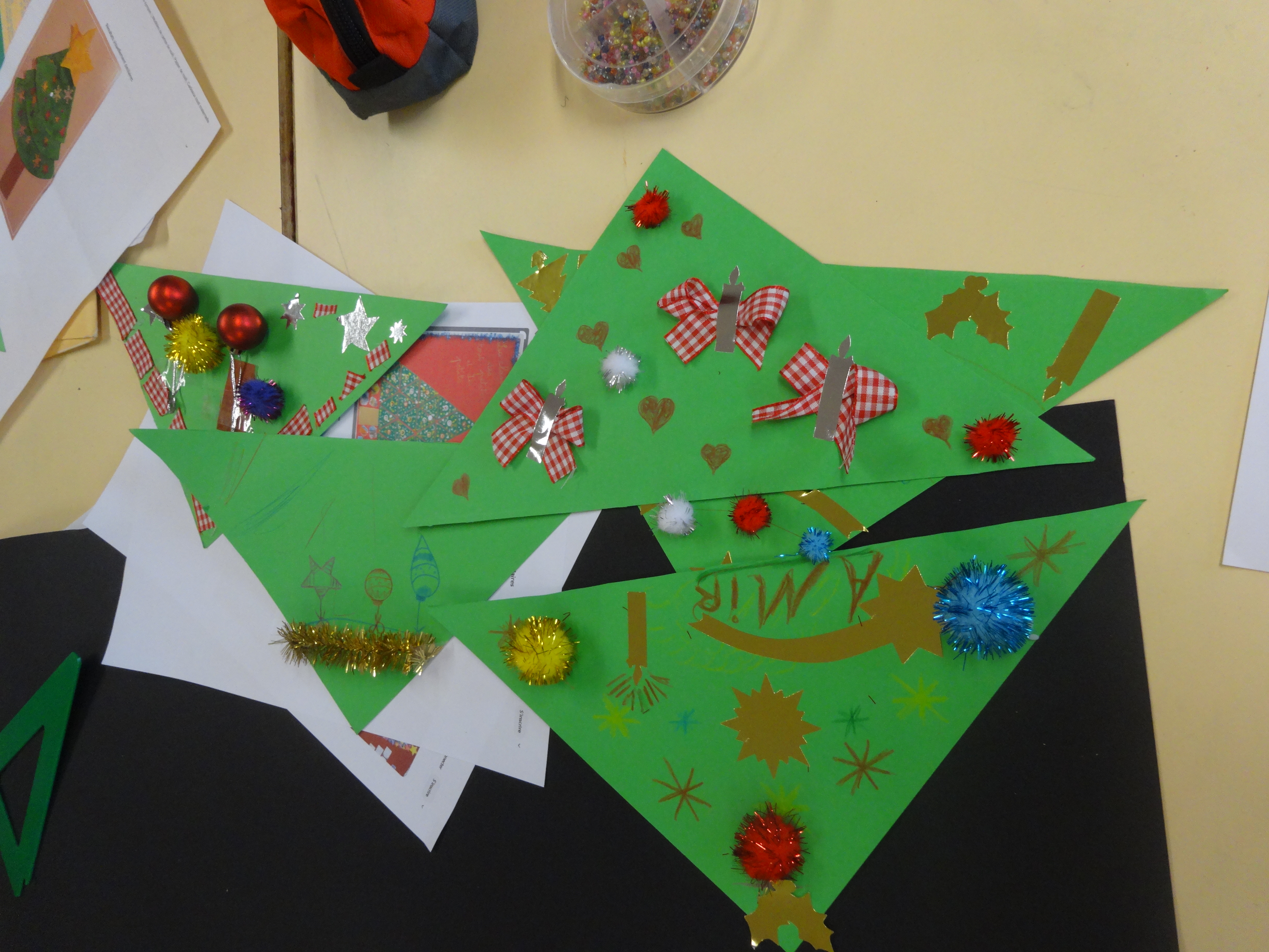 Paule raconte: "Pendant que D. ,chef de cuisine, préparait des gaufres dans le bureau de la Loco, dans la salle de cours, parents et jeunes enfants se sont prêtés au jeu du bricolage. Il s'agissait de fabriquer un sapin de noël.Chacun disposait d'un triangle de carton vert à décorer avec feutres, rubans, guirlandes, auto-collants... Grâce à Claire notre architecte, nous avons pu réunir tous ces chefs-d'œuvre pour former au mur un magnifique sapin.