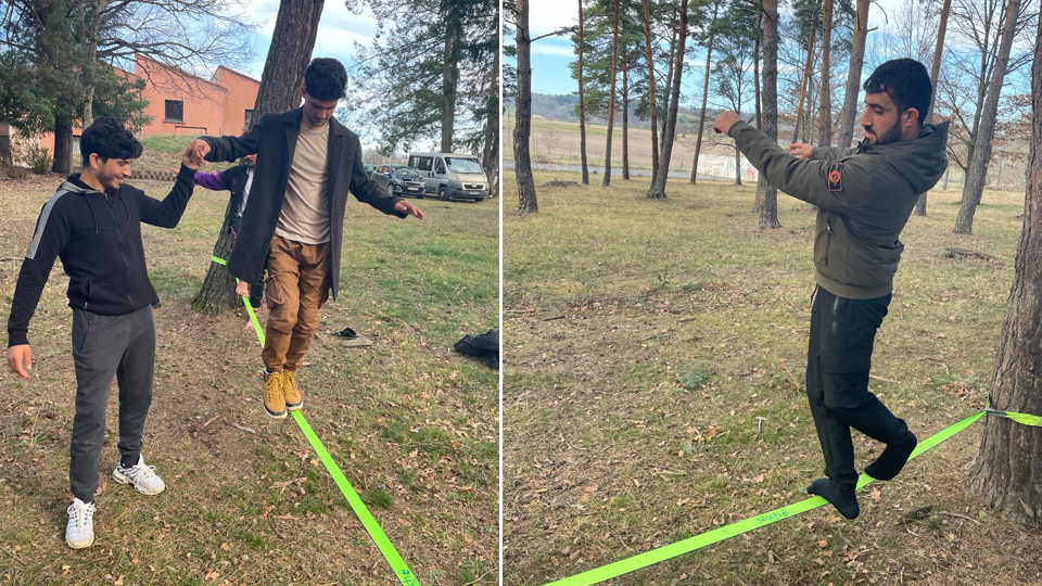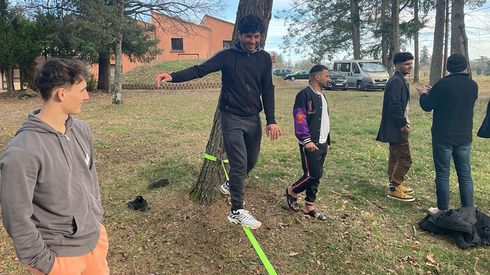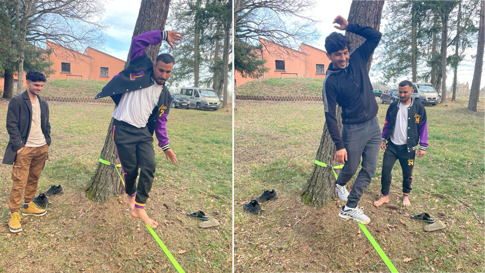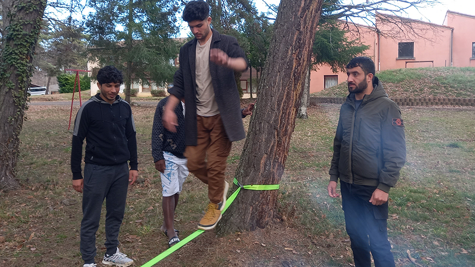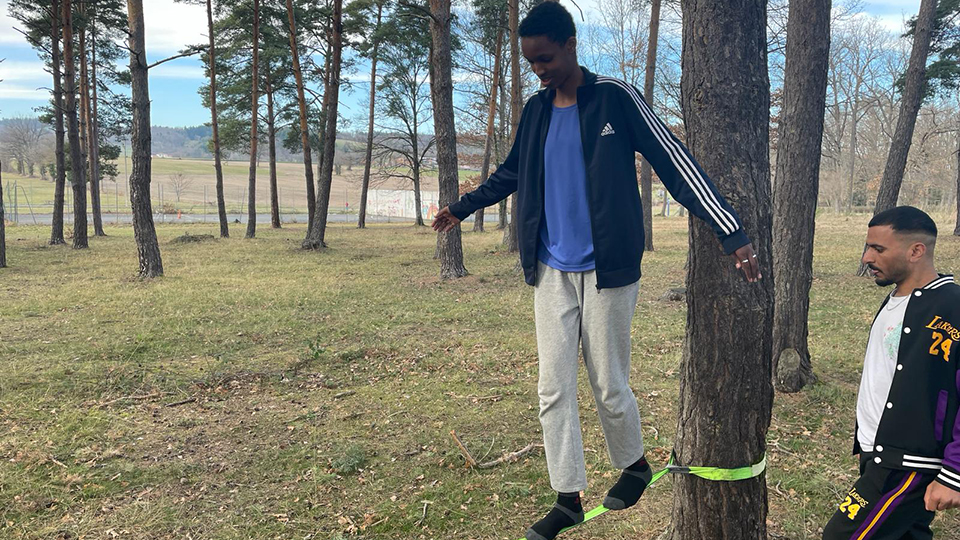 Lucas, éducateur sportif de la LOCO, qui a appris avec Lucie les rudiments de la pratique et l'installation du matériel se fera un plaisir de continuer à aider les résidents dans le laborieux apprentissage de la Slackline.