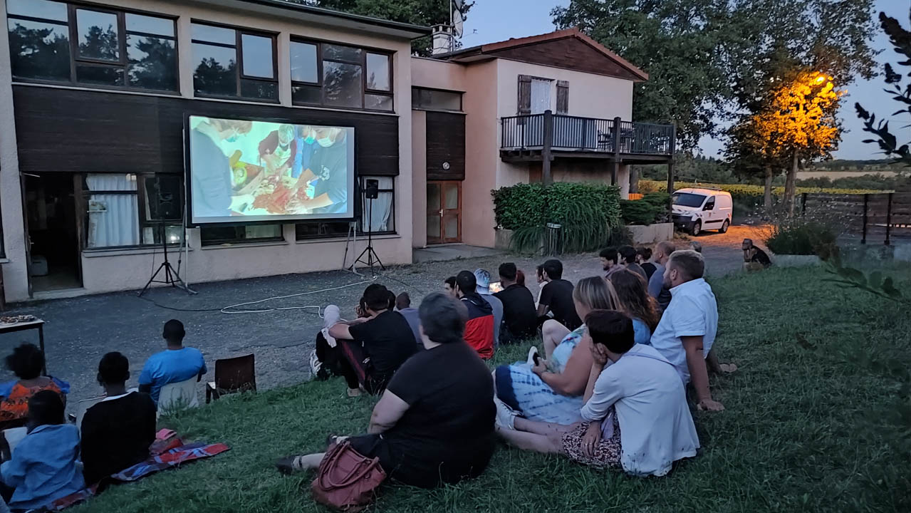 La nuit arrive tout doucement, et le programme est amorcé : des petits films relatant les différents ateliers en partenariat avec les associations partenaires (ateliers cuisine, repas partagés, atelier jardin, le marché de la Partagerie) ; les exclamations fusent lorsque l’un ou l’autre se reconnaît lors d’une activité et, ou apporte son témoignage.