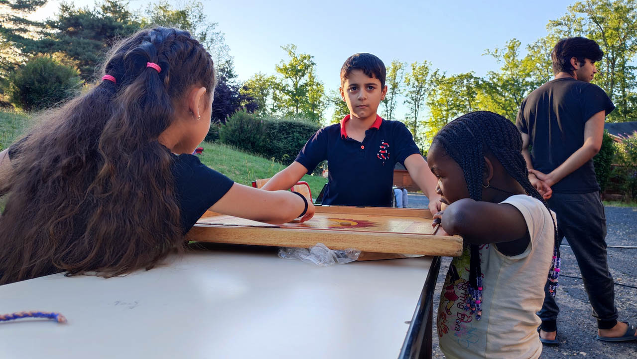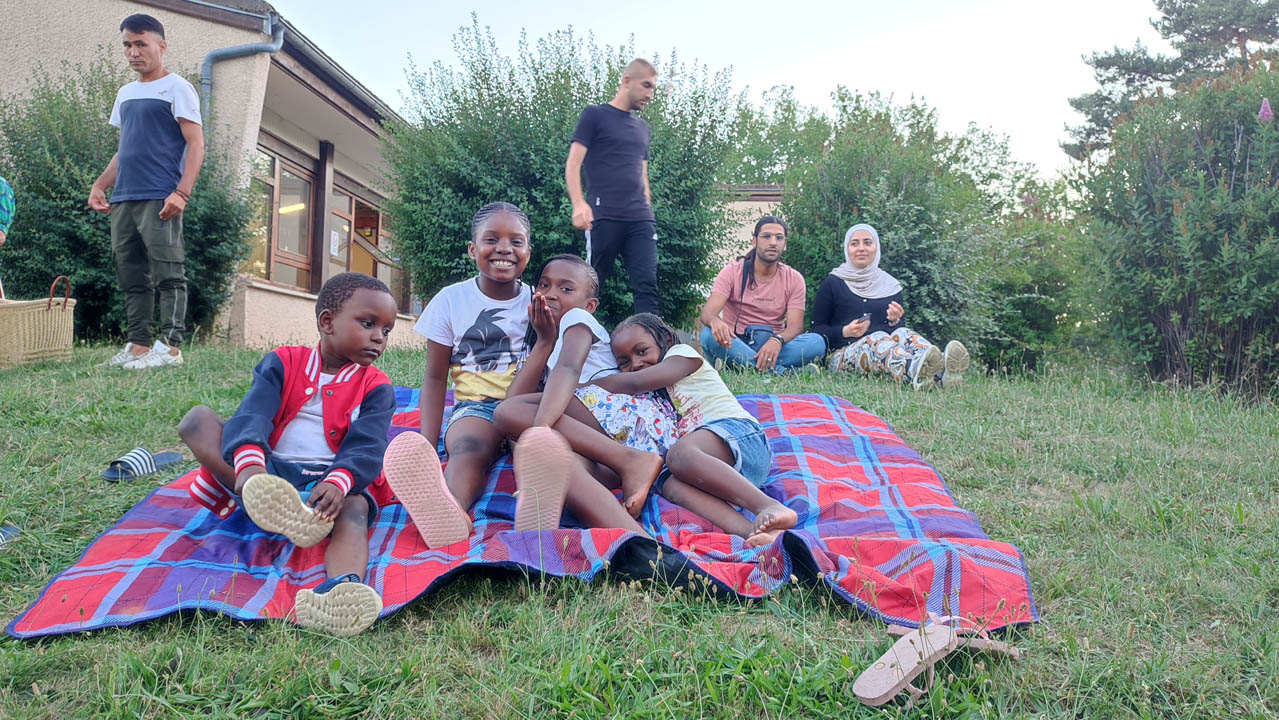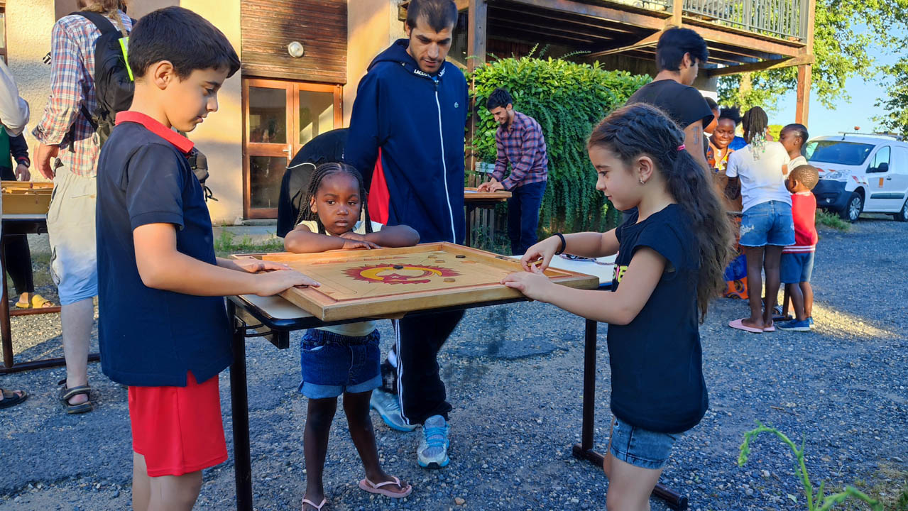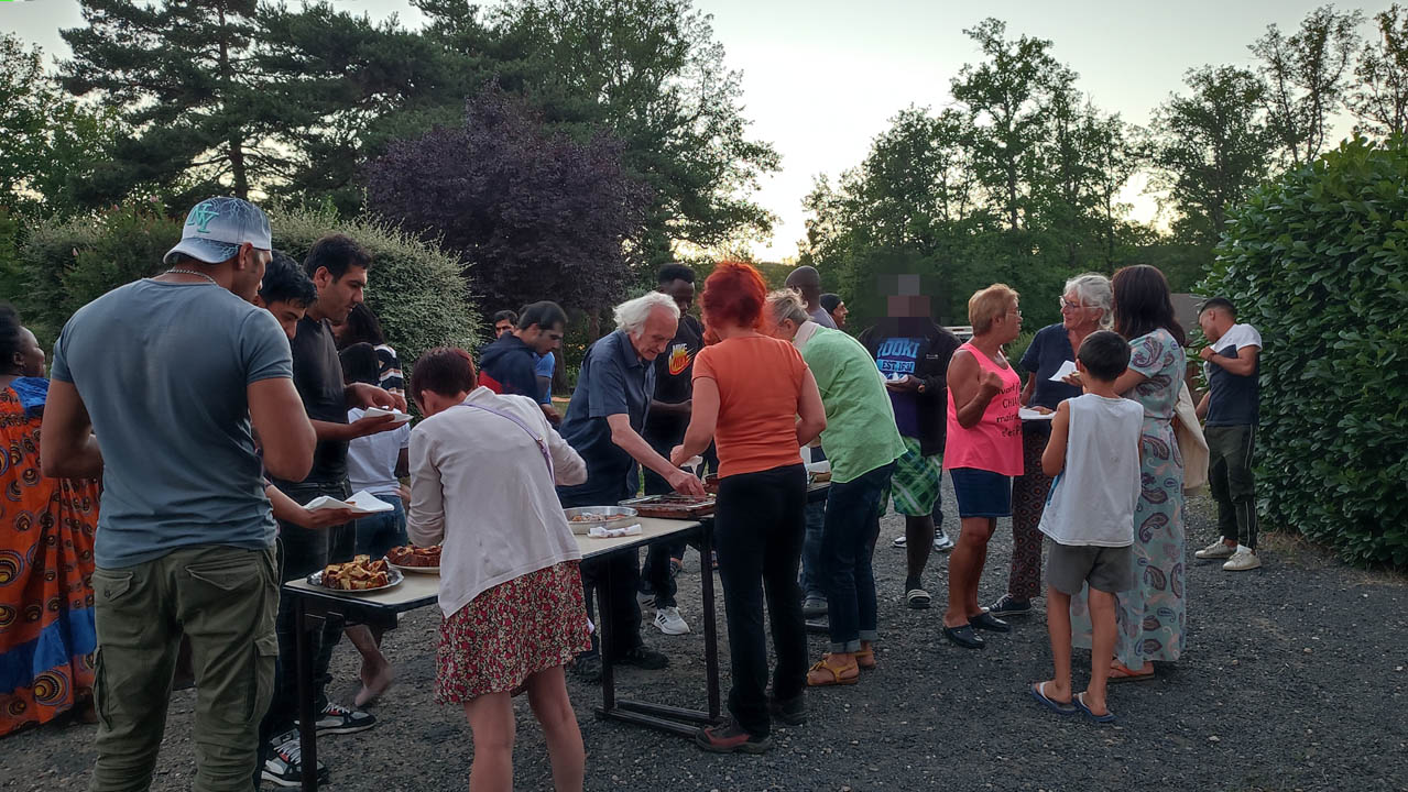 En attendant, petits et grands jouent à différents jeux - Soleil Devant avait apporté sa batterie de jeux en bois - avec engouement, et grands éclats de rire ! Ce n’est pas toujours les adultes qui gagnent et ces moments sont réellement des moments partagés entre enfants, adultes, demandeurs d’asile de différentes origines ; on parle français, anglais, arabe, patchtou , dari, bambara, arménien ….mais on finit par se comprendre et s’amuser ensemble ! Une dégustation de différents gâteaux est proposée et nombreux sont les gourmands.