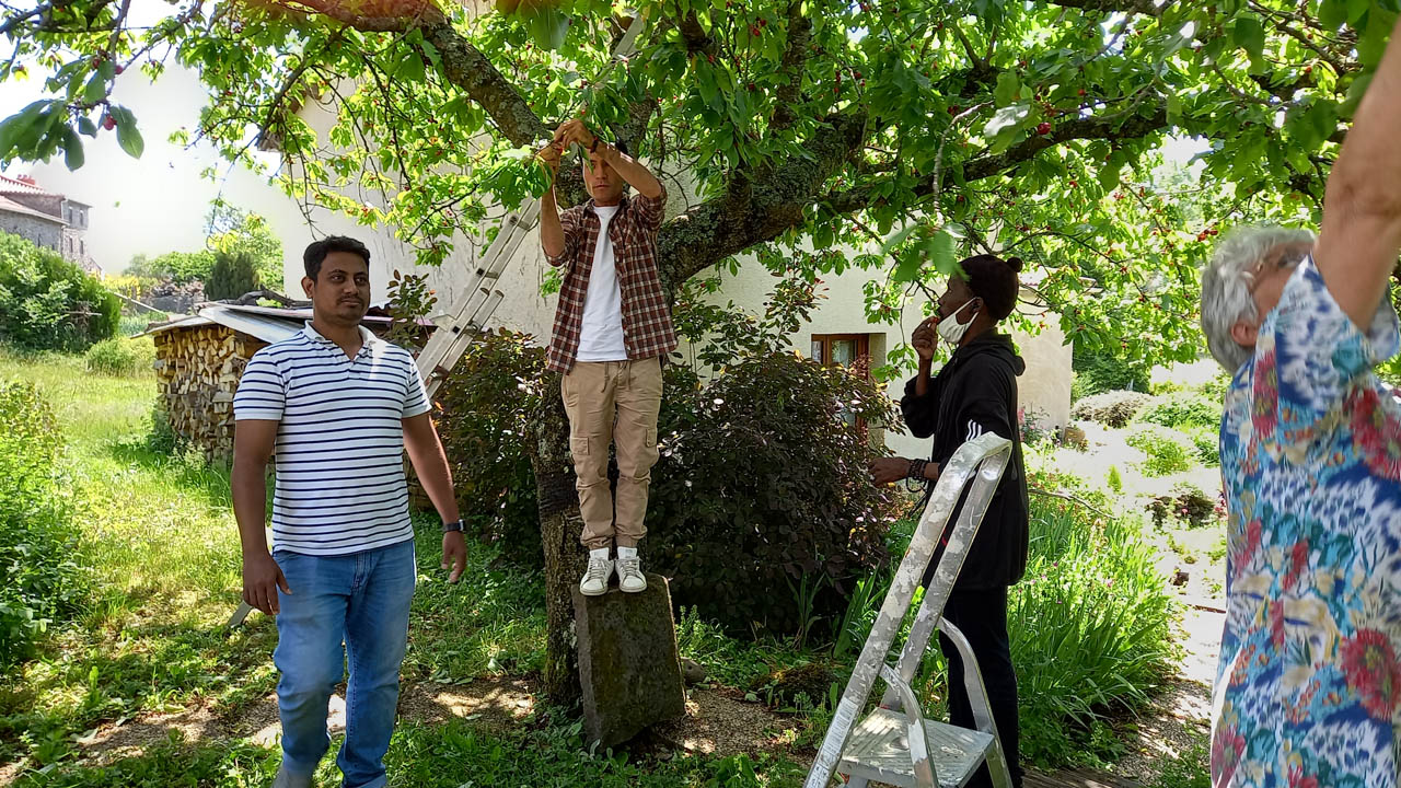 A leur arrivée samedi matin, après le tour du jardin (un rituel quand on va chez Paule), ils se sont arrêtés sous le cerisier et Paule les a invités à se servir et à manger les nombreuses cerises en montant sur l'arbre à l'aide d'un escabeau ou d'une échelle (Là, Paule, qui ne perd jamais une occasion d'apprendre aux résidents du CADA du vocabulaire français, explique la différence entre escabeau et échelle, comment ça s'écrit et se prononce).