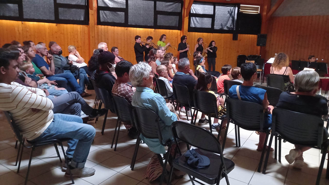 Le soir, au bourg de Molompize (la commune où se trouve le village de Trémoulet) l'École de musique de Hautes Terres Communauté donnait un ciné concert à la salle polyvalente. Des sélections de court métrages était projetées et accompagnées par les musiciens sous la direction de Tupac Silva. Le groupe, descendu de la montagne avec Paule, a beaucoup apprécié - "It's so beautiful" m'a dit Debu.