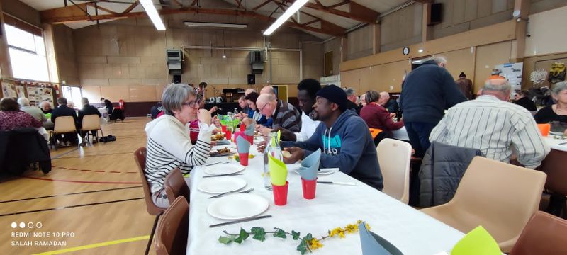 A une table, une personne à demandé à un bénévole de la LOCO, s’il était possible d’inviter des résidents du CADA à leur table. « Bien sûr ! c’est un des objectifs de ces repas, soutenir la rencontre ! » Plusieurs se sont donc retrouvés à table avec elle. La famille arménienne s’est également retrouvée à table avec des bénévoles. Cela est l’occasion pour ces derniers de concrétiser la protection que la France donne… un geste, un sourire, une attention bienveillante.