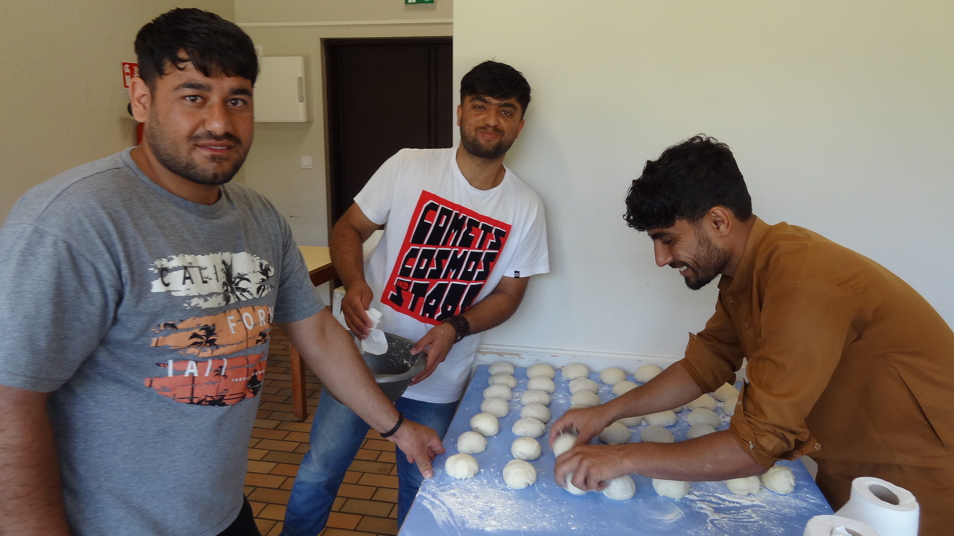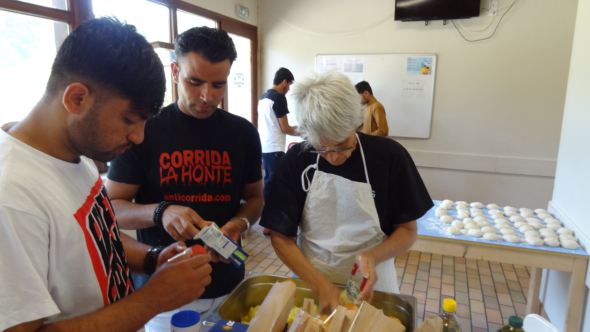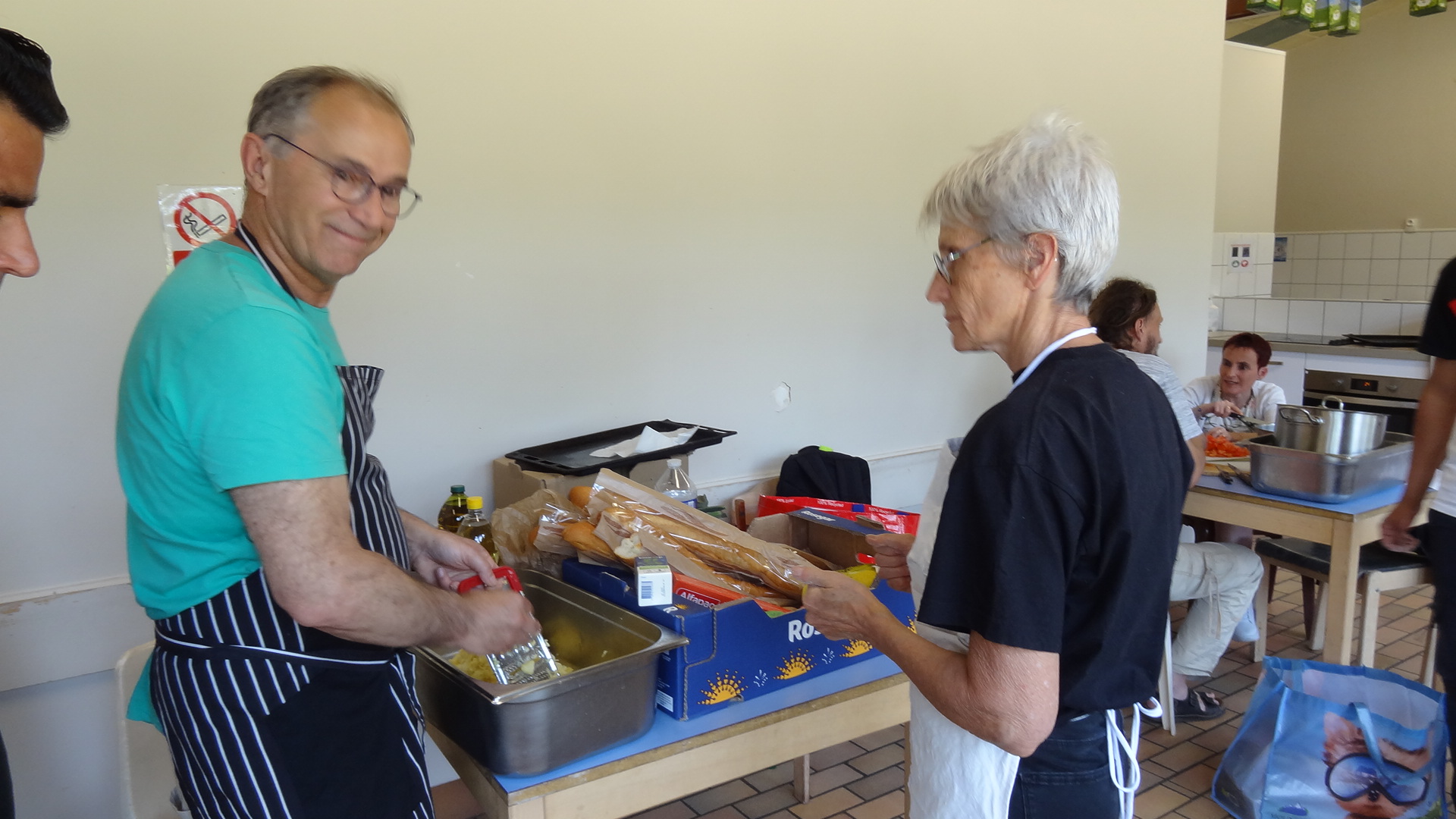 Vendredi 16 juin, en début d'après-midi, nous avions prévu de faire un Atelier cuisine avec les bénévoles et résidents dans les cuisines du bâtiment Nord en prévision du vernissage de l'Exposition du CADA "Portraits d'asile". Il s'agissait de préparer la partie "salé", le CADA s'occupant du "sucré".