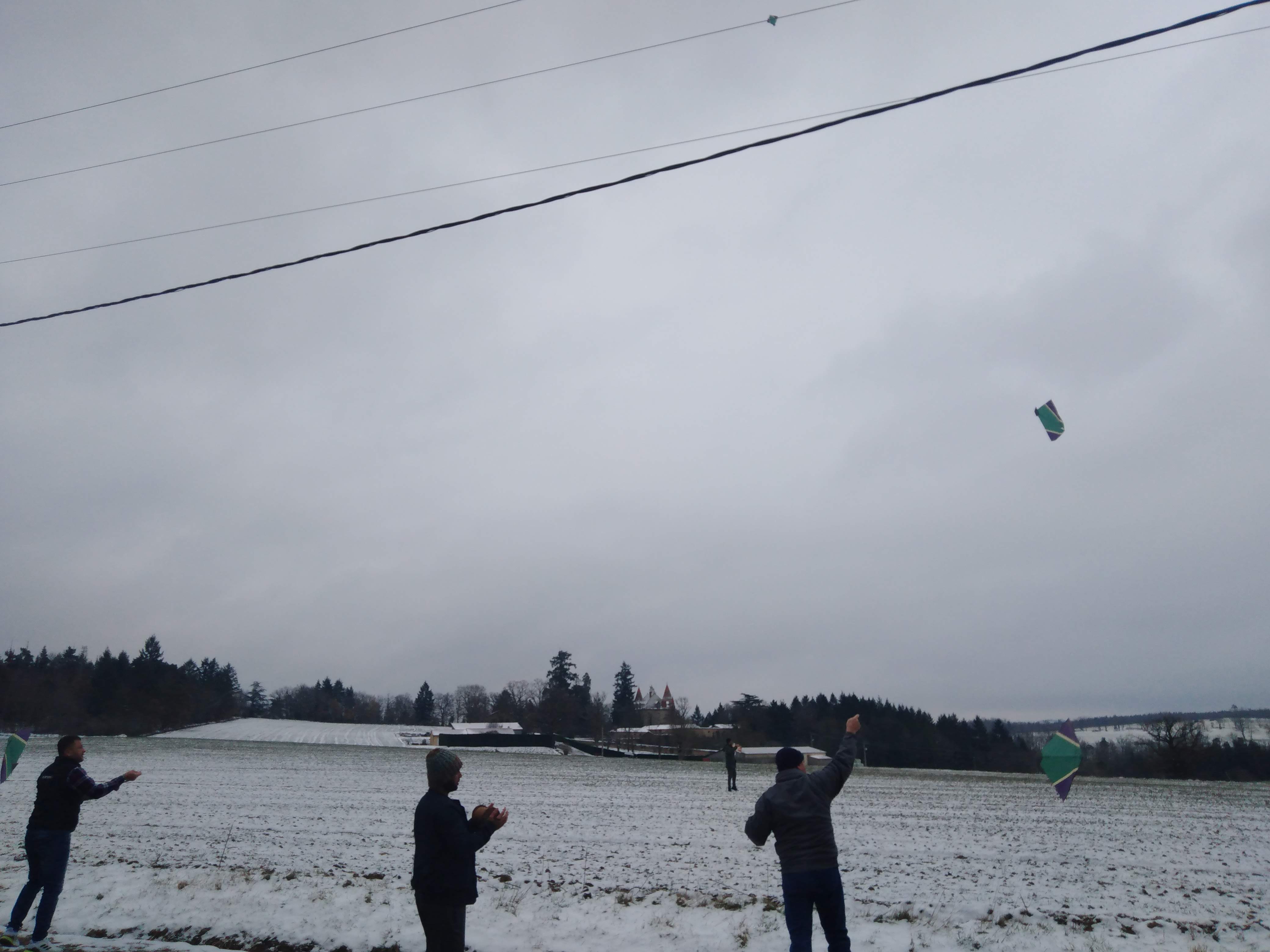 Mais pas à La Loco. Nous avons donc reçu Emmanuelle Bacherach, spécialiste en cerfs-volants de l’association Cultive ton ciel. Après nous avoir montré divers cerfs-volants impressionnants des quatre coins du monde, Manu a ouvert la malle contenant les petits cerfs-volants de combat. Quelle joie !!! Tous les afghans autour de la table était excités à la vue de ces cerfs-volants et l’excitation était à son comble quand Manu a sorti les bobines de fil spécifique à la bataille de Gudiparan. Impossible de maintenir le groupe à l’intérieur. Vite, vite tous s’avèrent des fin connaisseurs de cerfs-volants et fixent les fils aux cerfs-volants. 1 2 3 et hop dans les airs. Même si, on nous précise bien qu'en Afghanistan, on fait voler les Gudiparan un peu toute l’année, mais quand même pas quand il y a de la neige.