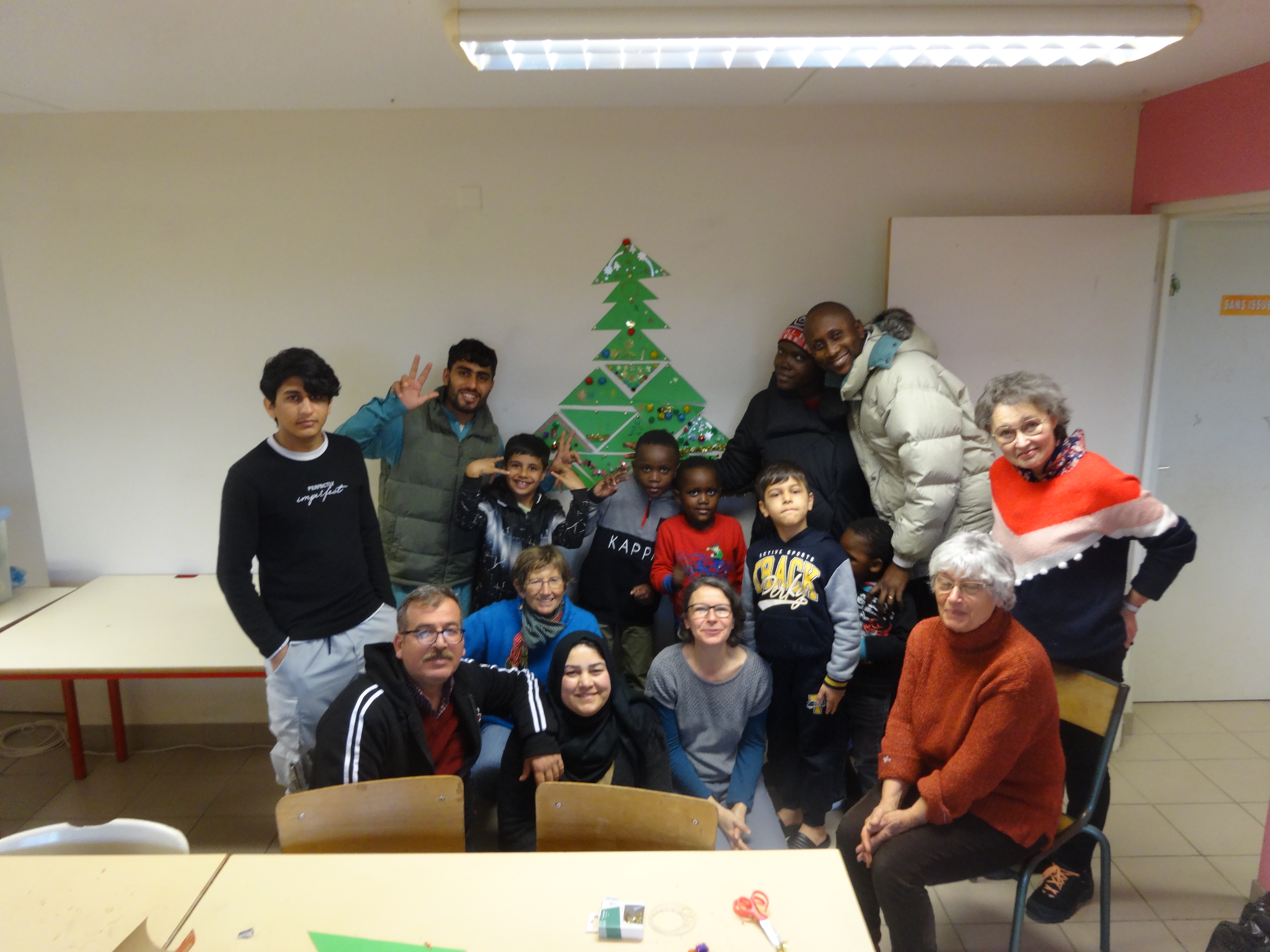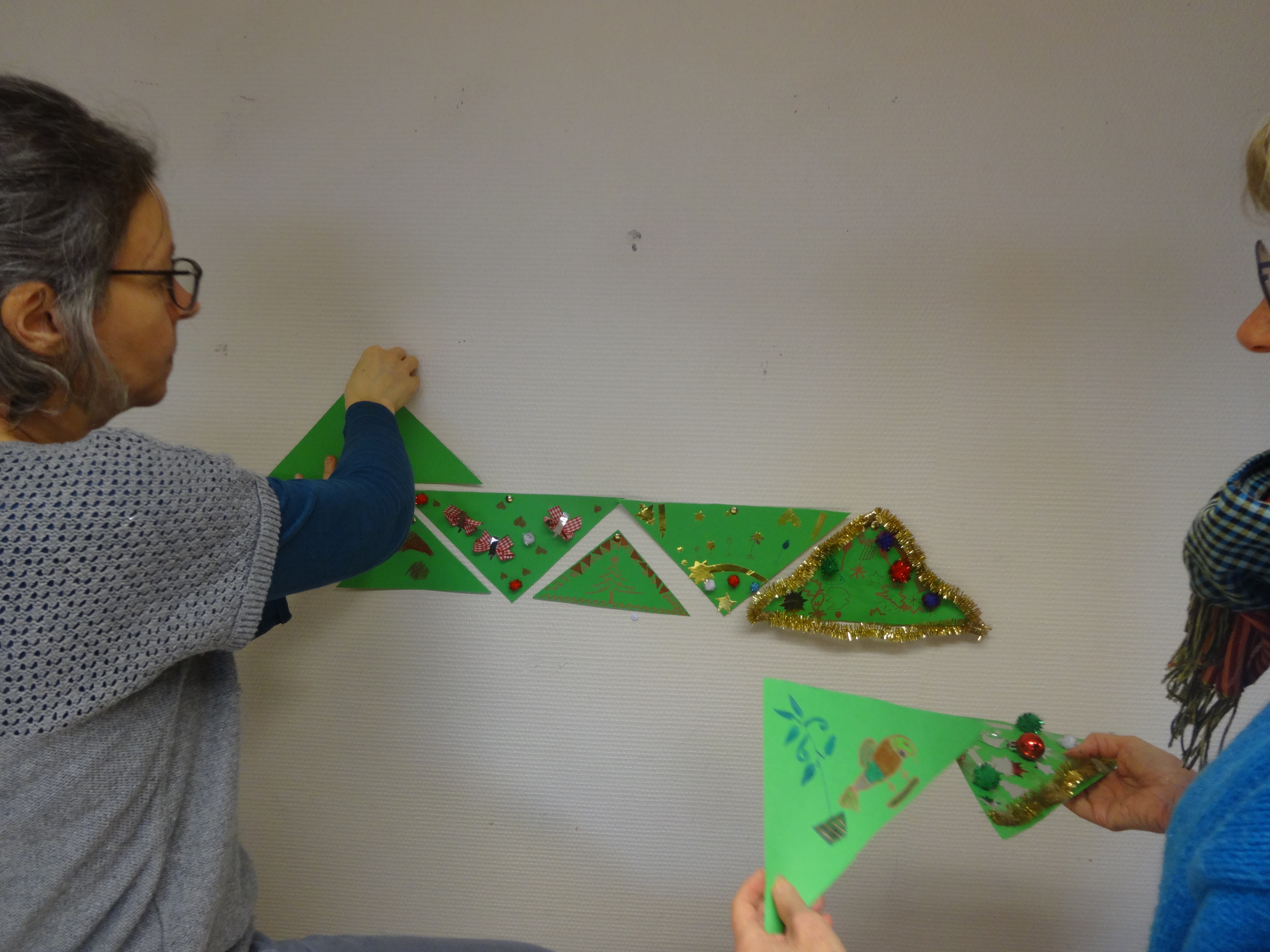 Paule raconte: "Pendant que D. ,chef de cuisine, préparait des gaufres dans le bureau de la Loco, dans la salle de cours, parents et jeunes enfants se sont prêtés au jeu du bricolage. Il s'agissait de fabriquer un sapin de noël.Chacun disposait d'un triangle de carton vert à décorer avec feutres, rubans, guirlandes, auto-collants... Grâce à Claire notre architecte, nous avons pu réunir tous ces chefs-d'œuvre pour former au mur un magnifique sapin.