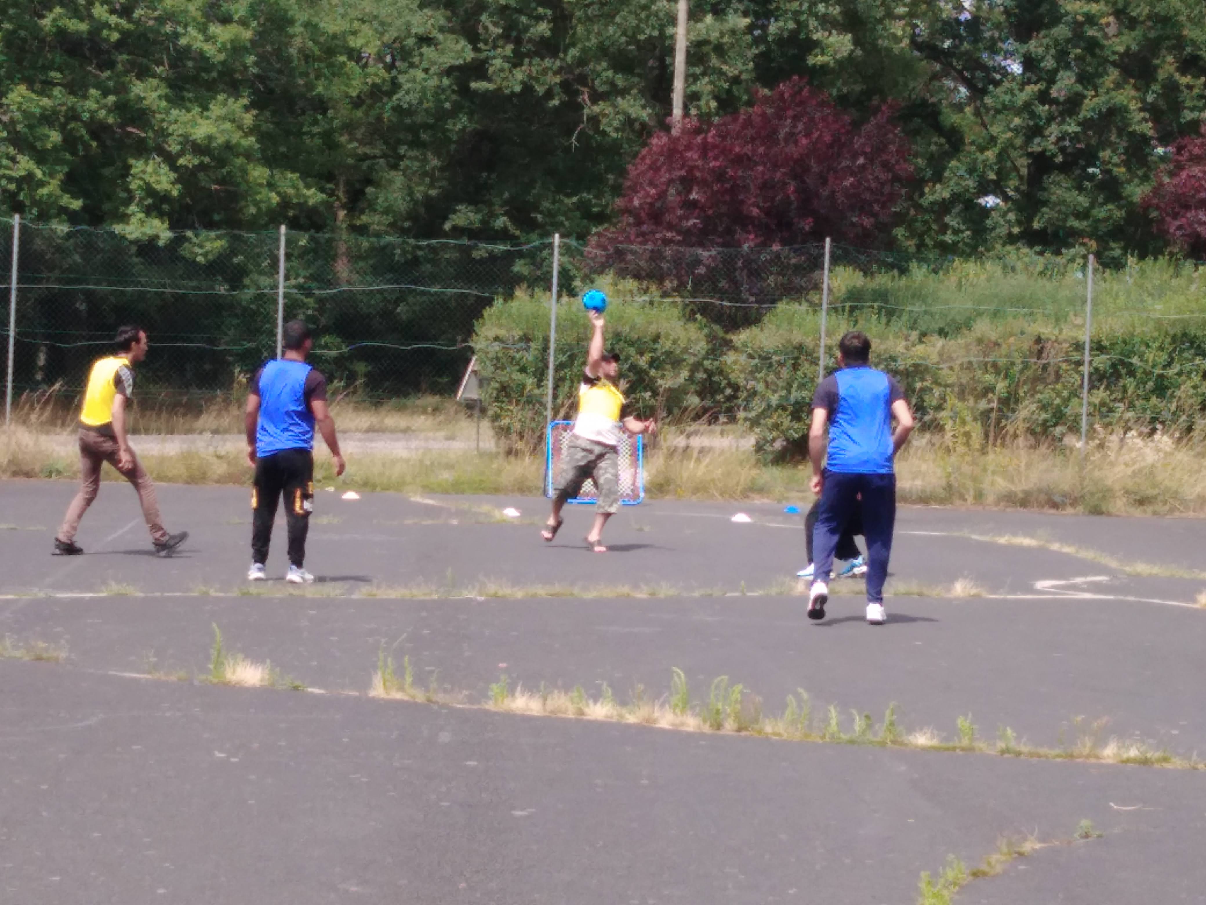 Mais d’abord, l’échauffement et la familiarisation avec la cible. Puis quatre équipes de 5 personnes ont été formées et le petit tournoi commençait. Finalement l’équipe jaune a remporté la victoire. Mais peu importe – l’important était de jouer ensemble et une fois de plus il était prouvé que le sport aide à dépasser les barrières de la langue.